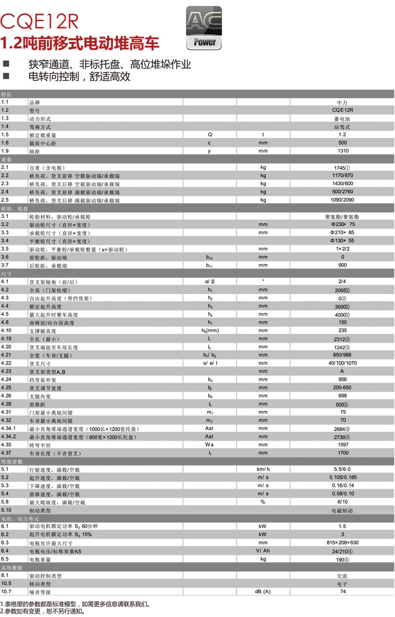 中力電動(dòng)叉車(chē),1.2噸前移式電動(dòng)堆高車(chē)CQE12R